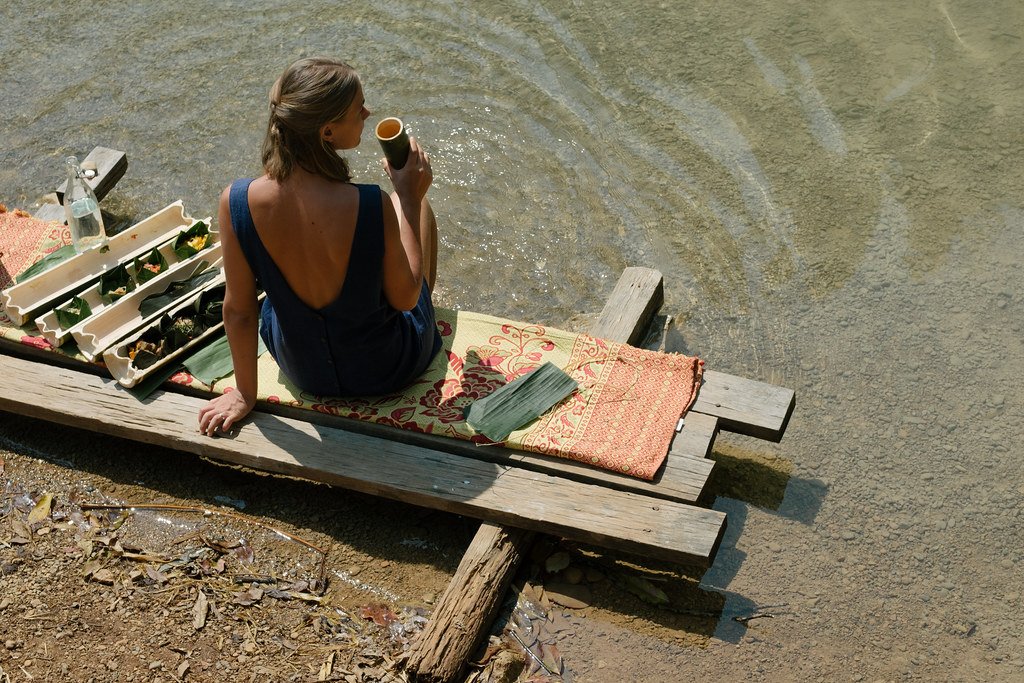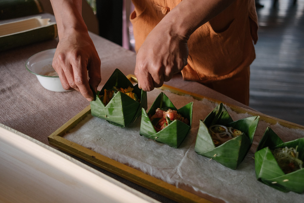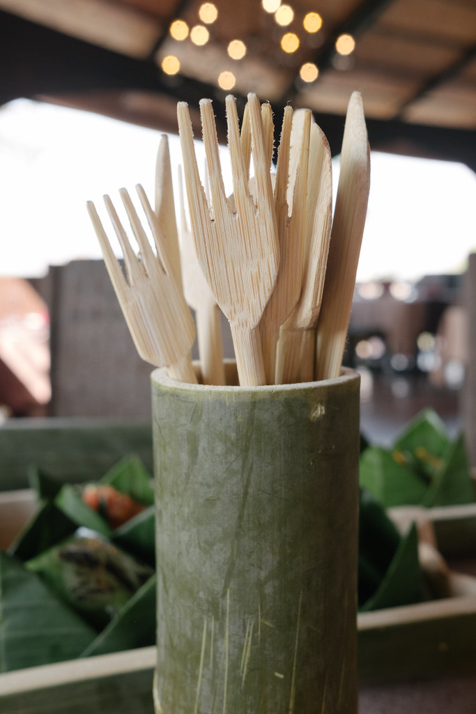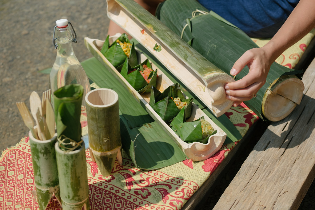 Meals are presented in two freshly cut, hollowed bamboo boxes. Bamboo is an effective natural thermos; food will remain at the right temperature for 4 hours. Main dishes are baked directly into the bamboo. Starters will remain chilled in the second sealed bamboo. Bamboo meals are presented in a palm weaved basket with organic paper napkin, bamboo fork, knife and spoon. All can be safely returned to nature after the meal or, if you wish, kept as souvenirs. Price includes bamboo fork, knife, palm hamper and organic paper napkins, and picnic station.